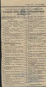 - Указ Президиума Верховного Совета СССР «Об утверждении образцов и описание лент к орденам и медалям СССР и Правил ношения орденов, медалей, орденских лент и знаков отличия» от 19 июня 1943 года // Ведомости Верховного Совета Союза Советских Социалистических Республик : газета. — 1943. — 23 июня (№ 23 (229)). — С. 1 – 2.