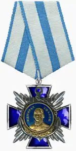 Знак ордена представляет собой покрытый синей эмалью серебряный четырёхконечный прямой крест с расширяющимися концами. По краям креста — узкий выпуклый рант.