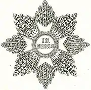 Звезда ордена — серебряная восьмиконечная. На центр звезды наложен золотой мальтийский крест белой эмали с золотыми языками пламени в углах. В центре креста золотой круглый медальон синей эмали с широким золотым ободком. В центре медальона девиз ордена в 2 строки — IN SENIO.