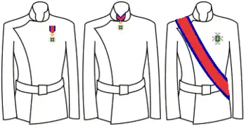 Орденская лента красного цвета с тёмно-синими полосками по краям.