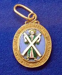 - К концу ленты крепится знак ордена, который соответственно носится у правого бедра. На аверсе знака изображён Св. Андрей. На реверсе на зелёном поле изображён чертополох окружённый девизом ордена.
