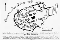 проходившая между двух стен (оборонительный тамбур — протейхизма площадью 100 м²) и заканчивающаяся у вторых ворот крепости шириной 2 м. От ворот к основному поселению вёл довольно крутой 30-ти метровый подъём, также защищённый протейхизмой (туда же вела лестница от калитки в протейхизме у первых ворот) — оборонительная система крепости была подобной прочим исарам Южного берега[4]. У стен крепости были обнаружены хозяйственное помещение с пифосами (кладовая?), остатки часовни, плитовые могилы[1], устроенные, возможно, уже после разрушения стен (не ранее XIII века). Крепостные стены исара возводились дважды: первые, из крупных («громадных») известняковых глыб, вероятно в VI—VIII веке и защищали поселение, погибшее в пожаре X века; на их остатках в XI веке были возведены новые, из более мелкого бута, просуществовавшие до XIII века. Небольшие жилые здания («хибарки») располагались на выровненных и расчищенных до скалы площадках (более 30 штук), без всякого порядка, между домами — улочки не более метра шириной. Всего, по расчётам историков, в поселении могло проживать 200—300 человек, признаков имущественного расслоения жителей обнаружено не было. На самой высокой точке горы раскопан фундамент здания размерами 8 на 13 м, предположительно — церкви. Считается, что укрепление располагалось у древней дороги из Гаспры в Ливадию и могло выполнять контролирующие функции[4][5].