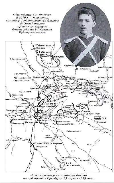 …обратный отход не предполагался, а отход под натиском противника ничем иным, кроме катастрофы, не мог быть, и поэтому приказ о наступлении мною был понят как решительная ставка — или прорыв фронта красных и взятие Оренбурга, или гибель дивизии.