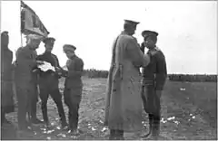 за то что в бою 8 Августа 1914 года у села Ярославице лично повел в пешем строю свой полк, выбил из двух деревень 5 неприятельских рот, захватил с боя два пулемёта и тем содействовал конной атаке 10-й кавалерийской дивизии.