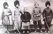 | Казаки 1-го ОКП пос. Агаповского. Харьков. | Оренбургские казаки с пленным японцем. 1904 г. | Проводы казаков на русско-японскую войну. Фото 1904 г. |