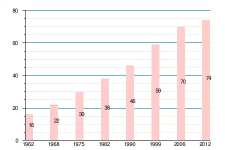 | 1962 | 1968 | 1975 | 1982 | 1990 | 1999 | 2006 | 2008 | 2010 | 2011 | 2012 |