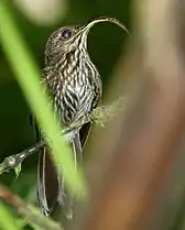 Длина тела составляет 13,5 см[2]. Телосложение мускулистое и крепкое[3]. Верхняя часть тела блестяще тёмно-зелёная, нижняя часть тела с широкими чёрными и белыми полосами. Хвост закруглён, коричневато-зелёного цвета, вершины рулевых перьев окрашены в белый цвет, подхвостье яркого оранжево-охряного цвета[2][4]. Клюв длиной примерно 3 см, изогнут книзу почти на 90 °. Подклювье жёлтое[3].