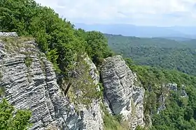 Абсолютно вертикальные обрывы высотой 125 метров над уровнем реки и 379 метров над уровнем моря, покрытые светлым известняком и жёлтым песчаником (отчего и зовутся Белыми). На их вершинах растут сосны, дубы, грабинники. В окрестностях Орлиных скал известно несколько карстовых пещер, самая крупная из них находится на глубине 15 метров.