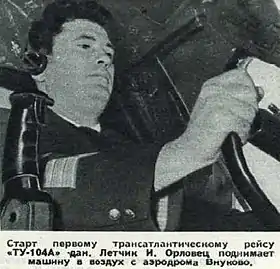 4 сентября 1957 года выполнил первый трансатлантический рейс из Москвы в Нью-Йорк на самолёте Ту-104А.[1][2] Орловец первым из командиров воздушных судов гражданской авиации получил высшее образование, первым из членов экипажей стал при выполнении международных полётов вести радиообмен «экипаж — диспетчер» на английском языке без переводчика.[3]