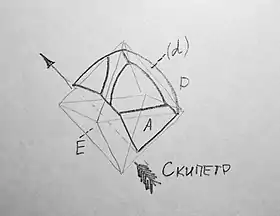 Характерной особенностью камня является его входящий угол: выколотая часть по спайности в основании пирамиды. Обе поверхности входящего угла образованы неполированными поверхностями спайности, главная из которых параллельна боковому утолщению алмаза. В сочетании с бороздками нижней грани они позволяют реконструировать очертания камня до инкрустации в скипетр. На схеме изображены теоретический октаэдр и обычный кристалл алмаза с закруглёнными гранями (d). Если сделать большой скол по спайности E и малый — по грани A, можно получить округлую головку многогранника, при затуплении сбоку гранью D, она будет чрезвычайно близка к современной форме «Орлова». При таких сколах и последующей огранке алмаз должен был потерять от четверти до половины изначального веса. Если «Орлов» является природным осколком более крупного камня, аналогично британскому «Куллинану», вероятно, округлого додекаэдра с двумя природными отколами по спайности, то его величина должна была составлять около 300—350 каратов, что подтверждают направление трещинок по спайности и треугольная выемка входящего угла[20].