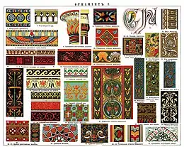 Древнегреческий орнамент — одним из его распространённых видов являлся меандр[21], который был представлен преимущественно в вазописи. Огромную роль играл геометрический стиль и морские волнообразные линии[22].
