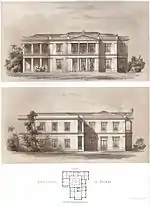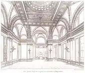 | Проект праздничного зала, из архитектурного альбома (1883) | Вход во дворец, фотоархив (1890) | Британское посольство в здании дворца, фотоархив (1937) |