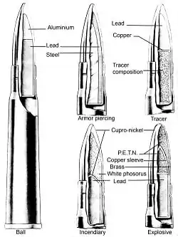 Этот тип патронов содержит зажигательный состав, который воспламеняется из-за деформации оболочки при попадании пули в преграду. Маркировка: носик пули окрашен в красный цвет. Стандарт NATO — носик синего цвета.
