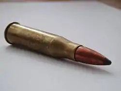 - латунной гильзы бутылочной формы с кольцевым выступом у основания — закраиной, вдавленным дном и выступающей из него наковальней, о которую разбивается ударный состав капсюля и от основания которой внутрь гильзы ведут три отверстия для сообщения огня заряду ;