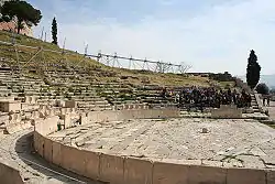 Сзади орхестры на некотором расстоянии возводилась скена (сначала — палатка для переодевания, затем выполняла функции сценического задника). Орхестру полукругом огибали сиденья для зрителей, сначала деревянные, потом — каменные. Первый ряд — проэдрия — предназначался для наиболее почтенных афинских граждан и не отгораживался от орхестры.
