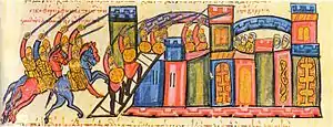 ![]() Взятие Алеппо войсками Никифора Фоки. Миниатюра из хроники Иоанна Скилицы, XII век | |||