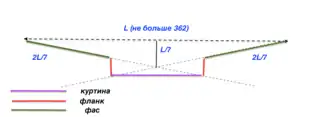 - Паган предложил, чтобы фланки были перпендикулярны оборонительной линии. Фронт рисовался по следующим правилам: стена имела форму многоугольника, сторона которого была не больше 362 метров. К стороне следовало провести серединный перпендикуляр с внутренней стороны и отложить отрезок, составляющий от 1/7 до 1/5 от стороны. Конец отрезка прямыми линиями соединялся с вершинами углов бастионов. На этих линиях откладывалась длина фасов, которая должна была составлять от 1/3 до 2/7 стороны многоугольника[10]. В системе Пагана были ещё усовершенствования: