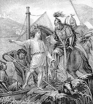 ![]() Великодушный поступок молодого киевлянина (во время осады печенегами Киева, 968). Худ. Б. А. Чориков. | |||