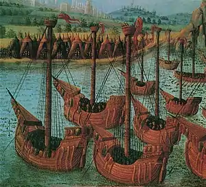 Для взятия Галаты и подступа к стенам столицы следовало прорвать железную цепь, преграждавшую вход в гавань Золотого Рога. Эта цепь, крепившаяся на громадных колоннах, тянулась от Галатской башни до Акрополя, поддерживаясь на поверхности воды деревянными поплавками[9]. Разорвать её можно было при помощи корабля, оснащенного специальным приспособлением в виде огромных кусачек, или мощным тараном.