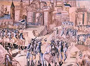 Осада Ла-Рошели — осада королевскими войсками Генриха Анжуйского оплота гугенотов — города Ла-Рошель в рамках Четвёртой гугенотской войны во Франции в 1572—1573 годах. Осада началась в ноябре 1572 года, когда жители города отказались впустить в город Армана де Гонто, барона де Бирона, в качестве королевского губернатора. Начиная с 11 февраля 1573 года, осаду возглавлял герцог Анжуйский (будущий Генрих III). Избрание герцога на престол Польши в мае 1573 года привело к снятию осады 6 июля 1573 года[2]. Подписанный вскоре Булонский эдикт положил конец этой фазе гражданской войны.