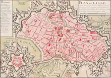 При взятии французами Лилля в 1667 году крепость в Лилле имела вид неправильного 4-угольника, длинные стороны которого простирались с северо-запада на юго-восток. Стены были бастионного и местами неправильного расположения с малыми равелинами. Вобан, производивший усиление и исправление крепости, построил перед бастионами и некоторыми равелинами контр-гарды; усилил фронты, более подверженные атаке, 4 горнверками и системою теналей. В западной части крепости он вновь выстроил 5-угольную цитадель из бастионных фронтов с равелинами, контргардами и двойным прикрытым путём. Река Дель, протекая через весь город, перерезала по середине длинные стороны крепостного прямоугольника; у входа её был устроен шлюз, чтобы можно было сделать наводнение, обстреливаемое несколькими батареями; всё это делало данную сторону крепости совершенно неприступной. У выхода Деля был возведён горнверк с воротами Святой Магдалины; между ними и воротами Святого Андрея находилось щипцеобразное укрепление с двумя люнетами, за которым был расположен демилюн с флангами. Крепость считалась одним из самых неприступных сооружений Франции.