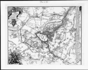 ![]() План осады, составленный союзниками. Север расположен внизу карты. | |||