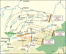 Лобовая атака представлялась дорогостоящей и затяжной, особенно после того, как Франция и Россия модернизировали свои укрепления на границе с Германией. Альфред фон Шлиффен, глава германского Генерального штаба (Oberste Heeresleitung «OHL»), в 1891—1906 годах разработал план по обходу французских пограничных укреплений наступлением северного (правого) фланга, который имел бы локальное численное превосходство и быстро одержал бы решающую победу. К 1898—1899 годам этот манёвр предполагал быстрый переход через Бельгию, между Антверпеном и Намюром, а затем создание угрозы для Парижа с севера[2]. Гельмут Мольтке (младший), сменивший Шлиффена в 1906 году, сомневался, что французы будут действовать в соответствии с предположениями германского Генерального штаба. Мольтке изменил планы развёртывания и сосредоточения, чтобы путём добавления дивизий к левому флангу (из ок. 1 700 000 человек, которых предполагалось мобилизовать в Westheer — «западную армию») адаптировать план к удару в центре или, как вариант, охватывающим ударам с флангов. Основные германские силы (правый фланг) всё же должны были продвигаться через Бельгию, чтобы через её юг наступать на Францию, французские же армии были бы охвачены левым фангом и оттеснены по рекам Маас, Эна, Сомма, Уаза, Марна и Сена без возможности отступления в центральную Францию. Таким образом французы либо были бы уничтожены ударом с севера, либо это создало бы условия для победы в центре, а то и в Лотарингии на общей границе[3].