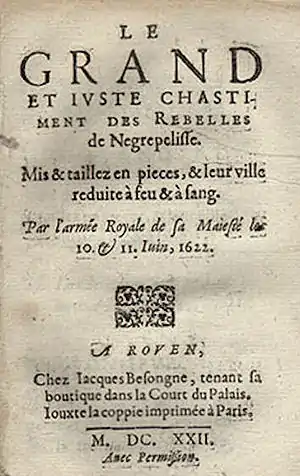 ![]() Обоснование бойни в Негрепелиссе - "Великое и справедливое наказание мятежникам Негрепелисса" | |||