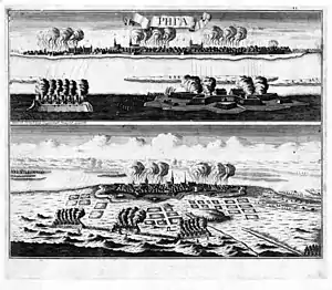 ![]() Вид и план осады Риги 14 июля 1710 года. Иллюстрация «Книги Марсовой» А.-М. Малэ (2-е издание). Оттиск второй половины XVIII века.[2] | |||