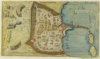 ![]() Изображение осады Фамагусты, выполненное во время осады в 1571 году (Равелин и Арсенал ещё не разрушены). Обозначено расположение османских батарей. Слева изображён взрыв на османском галеоне[k 2]. | |||