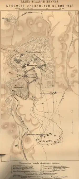 Заблокировав все попытки каджарской армии прийти на помощь Эривану, Гудович продолжил свою осаду. С целью отрезать крепость от воды русские перенаправили воду из канала Демирбулаг в открытое поле. Поскольку он являлся единственным источником воды в крепости, каджарская армии была вынуждена брать воду из реки Занги под огнем русских пушек. Несмотря на то, что русская бомбардировка также повредила часть стены, бастионы, усиленные французскими инженерами и оборонявшиеся свирепыми защитниками под командованием Хасан Хана, не давали русским возможности завладеть цитаделью[9].