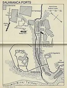 Веллингтон считал, что форты были спешно подготовленными средневековыми монастырями, и что их взятие пройдёт относительно легко. Из-за этого армия союзников привезла с собой только четыре 18-фунтовых орудия, к каждому из которых было только по 100 выстрелов. Фактически же оказалось, что три монастыря были усилены каменной кладкой из материала демонтированных зданий университета, дубовыми балками и землёй. Толщина стен монастырей была удвоена, их окна заложены, а подходы к ним защищались эскарпами, контрэскарпами и палисадами. Самый большой форт Сан-Винсенте, имевший 30 пушек, был расположен у юго-западного угла старой городской стены. Сан-Каэтано с четырьмя пушками находился к юго-востоку от Сан-Винсенте. К югу от Сан-Каэтано находился Ла-Мерсед с двумя орудиями, которые мешали союзникам использовать римский мост через Тормес. Сан-Винсенте и Ла-Мерсед возвышались над Тормесом и были практически неприступны для нападения с юга и запада. Только северные стороны Сан-Винсенте и Сан-Каэтано были пригодны для атаки. Сан-Винсенте был отделен от Сан-Каэтано и Ла-Мерсед оврагом, который шёл на юго-запад к Тормесу. Три форта были построены так, чтобы прикрывать друг друга; колонна, атакующая один форт, попадала под перекрёстный огонь других фортов[13].