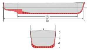 - Проектная осадка по мидельшпангоуту — расстояние от ватерлинии до наружной кромки обшивки у киля
