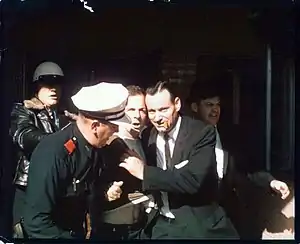 Когда приехала полиция, Брюер опознал его, и Освальд вышел сдаться со словами: «Ну всё, это конец»[113], а затем ударил офицера. После борьбы он был разоружён[114]. Когда его выводили из театра, Освальд крикнул, что он — жертва жестокости полиции[113].