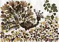 Каждый элемент с особой тщательностью и осторожностью размещается на своём месте; воображение и ювелирная точность художника заставляет листья превратиться в деревья, лепестки — в силуэты гор.