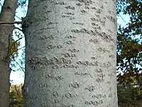 Кора молодых деревьев гладкая, светло-зелёная или зеленовато-серая, ближе к комлю с возрастом растрескивается и темнеет. Древесина белая с зеленоватым оттенком.