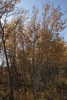 Крупные кустарники, такие как кизил блестящий, ива Бебба, ирга, черёмуха виргинская и черёмуха пенсильванская, а также более мелкие кустарники, в том числе шиповник иглистый, снежноягодник, лещина рогатая и калина трёхлопастная, образуют плотный переплетённый подлесок. Густой кустарник является характерной особенностью лесов с преобладанием осины. Обычные травы, встречающиеся в лесных массивах, включают: астру Линдли (Aster ciliolatus), подмаренник северный (Galium boreale), фиалка канадская (Viola canadensis), ежевика сизая и дёрен канадский. У подножия деревьев и на земле появляются мхи.