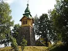 - Двухъярусная отдельно стоящая колокольня (нижний ярус — камень, верхний — дерево, начало XX века)