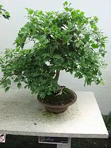 Кустарник или небольшое деревце от 2 до 8 метров в высоту. Листья до 5 см длиной, пильчатые по краям, молодые листья с розовыми, старые — с кремовыми или бежевыми краями. Плод с косточкой тёмно-фиолетового цвета, яйцевидной формы, размером примерно 1,5×1 см.