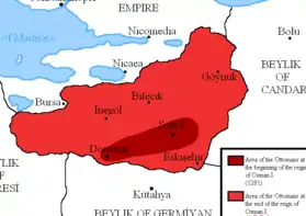 Поздние османские источники упоминают битву при Димбосе (проход через перевал по пути от Коюнхисара к Бурсе), состоявшуюся в 1303 году. Согласно им, в этой битве победил Осман, хотя обе стороны понесли большие потери. Ещё один племянник правителя (Айдогду-бей) погиб. В отличие от битвы при Вафии, эта битва никакими сторонними или современными событиям источниками не подтверждается[74]. В 1305 году отряды кайы взяли крепости Шиле и Йорос[75]. Противостоять набирающим силу отрядам Османа было всё сложнее. Андроник II нанял каталонцев, и у Лефкаи отряды Османа были разбиты. Однако вскоре силы Византии оказались подорваны бунтом наёмников и внутренними распрями[76]. Конийский султанат, длительное время бывший главным соперником Византии в Малой Азии, в 1307 году распался, и его место оказалось занято бейликами, ранее зависимыми от него[77]. Отношения Османа с соседями были сложными, с Гермияногуллары происходили постоянные конфликты[78].