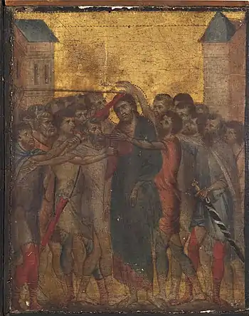 Это единственное известное малоформатное произведение Чимабуэ, в котором художник использовал те же приёмы для демонстрации множества фигур, что и для других своих, более масштабных, работ, таких как фрески в Ассизи. Сцена следует библейскому изложению в Евангелии от Матфея 27 : 27-30. Иисус, в красной мантии и синем плаще, помещён в центр композиции, с открытыми глазами в византийском стиле (на изображениях того же периода из Северной Европы он бы сидел с завязанными глазами). Он бесстрастен, с обмякшими руками и печальным выражением лица, среди толпы людей чуть ниже его ростом, которые сердито бьют Христа прутами, мечом в ножнах или голыми руками; кажется, что кто-то пытается сбить нимб Христа. Также по обе стороны от Христа стоят по одному человеку с мечами в ножнах; здания на заднем плане, выполненные в византийской обратной перспективе, обрамляют сцену под сияющим золотым небом[5][6][2].