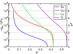 а также несколько характерных точек. Первая точка соответствует pF близкому к 0, то есть почти полностью заполненному водой поровому пространству почвы (достичь абсолютно полного заполнения редко удаётся). Место первого изгиба кривой называют «давлением выхода воздуха (барботирования)». Между первой и второй точками изменение давления почвенной влаги приводит лишь к изменению кривизны капиллярных менисков, но не к изменению влажности. От второй точки и далее изменение давления означает изменение доли почвенных пор заполненных водой (и пор, заполненных воздухом). Третья точка отражает влажность, соответствующую переходу области плёночно-капиллярной влаги к сорбционной.