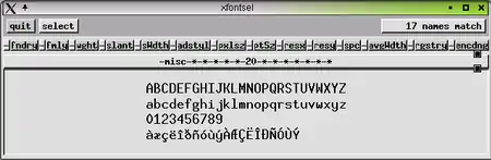 xfontsel позволяет увидеть начертание символов в шрифте.Имена шрифтов на уровне основного протокола X Window — это произвольные строки. Соглашение, логически описывающее шрифт для X, определяет, как именно должны быть названы шрифты в соответствии с их атрибутами. Эти соглашения также указывают значения дополнительных свойств, которые могут иметь шрифты.