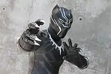 - Костюм Чёрной пантеры (основанный на одноимённом костюме из Marvel Comics) — защитный нанотехнологический костюм, сотканный из вибраниума, который носит король Ваканды, когда выступает в качестве Чёрной пантеры. Костюм оснащён выдвижными когтями из вибраниума и почти непроницаем. Версии костюма носили Т’Чака, Т’Чалла и Н’Джадака с течением времени. Второй костюм Т’Чаллы также способен сжиматься в ожерелье, а также поглощать энергию для будущего перераспределения. Костюм представляет собой комбинацию практичного костюма и визуальных эффектов, в котором присутствует плетение из вибраниумной сетки, похожее на кольчугу[99]. Художница по костюмам фильма «Первый мститель: Противостояние» Джудианна Маковски назвала костюм Чёрной пантеры «сложным», поскольку «вам нужно было что-то вроде кошачьего тела, но это сложно и практично одновременно. Вам нужно было чувство какой-то этнической принадлежность, но мы ещё не создавали мир [Ваканды], поэтому не хотелось заходить слишком далеко и слишком много говорить об этом мире»[100].