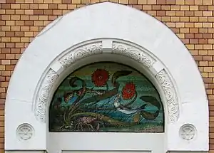 В арочной нише над порталом входной двери расположено полихромное мозаичное панно с изображением водорослей и обитателей подводного мира. В правом нижнем углу панно имеется монограмма «W. W.», более в застройке Москвы нигде не встречающаяся. Судя по этой подписи, предположительным автором панно является другой известный мастер московского модерна, сотрудник бюро Кекушева в период проектирования гостиницы «Метрополь» и его коллега по работе в Московском торгово-строительном акционерном обществе — Вильям Валькот, который подписывал некоторые свои эскизы и графические работы аналогичным образом. Между первым и вторым этажом по уличному ризалиту идёт орнаментальный мозаичный фриз с изображением на золотом фоне подснежников. Как в предыдущих, так и в последующих работах Кекушева оформление фасадов мозаикой более не встречается[94][84].