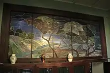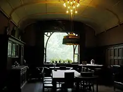 Самой большой комнатой особняка была гостиная на первом этаже. В центре располагался камин из каррарского мрамора с изображением полуобнажённой женщины-бабочки, распахнувшей крылья. Особенное внимание привлекает витражная картина, украшающая прихожую. Она визуально меняет цвет в зависимости от позиции смотрящего — от синего до ярко-жёлтого. Витражный пейзаж подчёркивает символическую концепцию декора дома — единение человека с природой[40]. Рядом с прихожей находится кабинет, обильно декорированный мотивом лаврового дерева, древнего символа славы, успеха и победы. Этот узор повторяется в деревянной отделке, витраже, дверных ручках. Бо́льшая часть мебели кабинета после революции утрачена. Сохранился только один оригинальный предмет, выполненный по эскизам Шехтеля, — небольшой шкаф над камином[43].