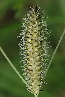 Верхние (1[3])2—3(7[3]) колоска тычиночные, линейные, 3—6 см длиной[3], с линейно-ланцетными, острыми, ржавчатыми чешуями. Пестичные колоски в числе 2—4, цилиндрические, (0,7)0,8[3]—0,9[3](1) см в диаметре, (3)3,5—9(10[3]) см длиной, рыхловатые, книзу редеющие, нижние на ножках до 5 см длиной, прямые. Чешуи пестичных колосков ланцетные, острые или тупые, ржавые или светло-ржавые, со светлым линейным килем, с одной жилкой, короче и у́же мешочков. Мешочки округло-яйцевидные, вздутые, 4—5(6) мм длиной, желтовато-зеленоватые или, редко, вверху буроватые, зрелые косо вверх, реже горизонтально отклонённые от оси колоска, плотно или рыхловато расположенные, перепончатые, с многочисленными тонкими жилками, слабо глянцевитые, в основании округлые, сидячие или на ножке не более 0,2 мм длиной, с гладким, почти цилиндрическим, явственно двузубчатым носиком (1)1,2—2 мм длиной; зубцы 0,4—0,5 мм длиной. Рылец 3. Нижний кроющий лист без влагалища, значительно длиннее соцветия.