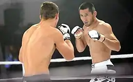![]() Оспанов в бою с А. Полпудниковым на турнире «Плотформа S-70» в 2013 году. | |