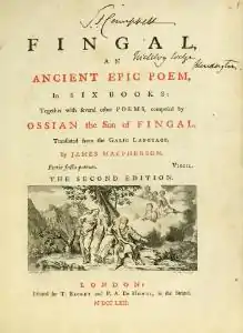 - Fingal, an ancient epic poem, in six books: together with several other poems, composed by Ossian the son of Fingal. Transl. from the Galic language, by James Macpherson. London, 1762. Имеется Дублинское издание того же 1762 года, и не вполне понятно, какое из них следует считать первым.