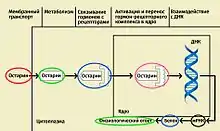 Остарин, как и другие селективные модуляторы андрогенных рецепторов (SARM), связывается с определенными рецепторами андрогенов и оказывает направленную анаболическую активность исключительно на скелетно-мышечную ткань в отличие от тестостерона и других анаболических стероидов и прогормонов. В результате метаболизма остарин попадает в кровь, затем за счет мембранного транспорта проникает в цитоплазму и связывается с андрогенным рецептором. Связывание с определенным доменом в андрогенном рецепторе приводит к активации рецептора. Активированный рецептор перемещается в ядро, где присоединяется к гормон чувствительному элементу гена. За счёт присоединения активируется транскрипция гена-мишени, образуя специфический белок. Связывание и активация рецептора андрогена изменяет экспрессию генов и увеличивает синтез белка и, следовательно, приводит к увеличению скелетно-мышечной ткани[9][10].